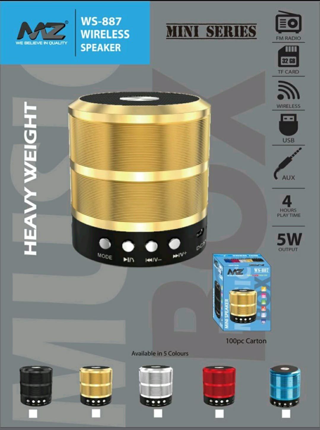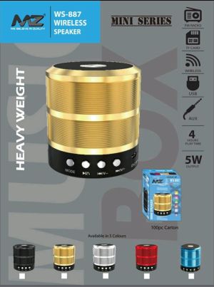 The MZ WS-887 Mini Bluetooth Speaker is a compact powerhouse that redefines portable audio. With advanced Bluetooth connectivity, this mini speaker allows wireless streaming from your devices, offering a convenient and wire-free experience. Despite its small size, the WS-887 delivers surprisingly robust sound with clarity and depth. The built-in rechargeable battery ensures extended playtime, making it perfect for on-the-go music enthusiasts. Its sleek and modern design adds a touch of style, while the user-friendly controls make operation a breeze. Elevate your portable audio experience with the MZ WS-887 Mini Bluetooth Speaker – a pocket-sized dynamo delivering big sound wherever you go.