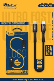 The SoRoo 13A 65W Type C to C Cable is a high-powered charging accessory designed for Type C-compatible devices. With an impressive 65W output and a robust 13A current, this cable facilitates rapid and efficient charging, ensuring a quick and reliable power boost for your devices. The cable by SoRoo is built for durability, providing a sturdy and dependable charging solution. Elevate your charging experience with the SoRoo 13A 65W Type C to C Cable – a robust and high-performance accessory for powering up your Type C devices.