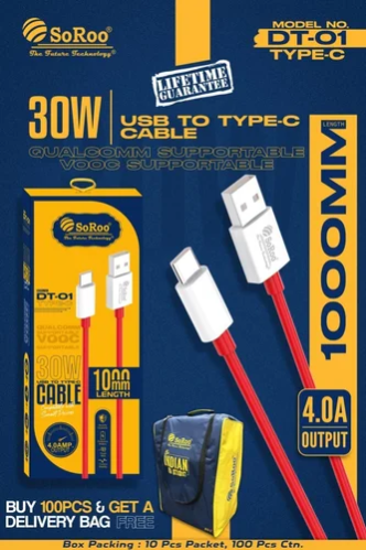 The SoRoo DT-01 30W 4A Type C Cable is a high-powered charging solution designed for Type C-compatible devices. With an impressive 30W output and 4A current, this cable delivers swift and efficient charging, ensuring your devices receive a quick and reliable power boost. The DT-01 cable is not only powerful but also built to last, providing a durable and trustworthy charging option. Elevate your charging experience with the SoRoo DT-01 30W 4A Type C Cable – a robust and high-performance accessory for charging your Type C devices.