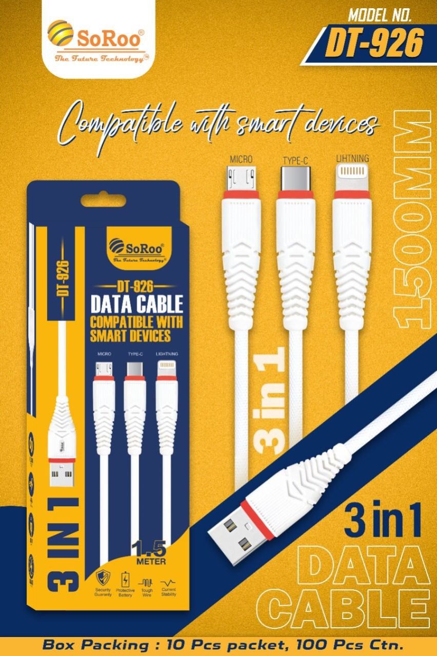 The SoRoo DT-926 3-in-1 Cable is a versatile charging solution that combines three different connectors in one cable. With compatibility for Type C, Micro USB, and Lightning devices, this cable provides a convenient and universal charging option. The DT-926 cable ensures efficient charging with a reliable power supply for various devices. Its durable construction adds longevity to this multi-functional accessory, making it an ideal choice for users with diverse charging needs. Simplify your charging setup with the SoRoo DT-926 3-in-1 Cable, a practical and efficient solution for powering up different devices.
