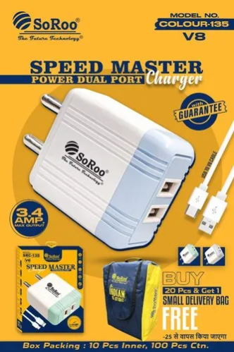 The SoRoo SRC-120 3.4A V8 2-USB Charger is a high-powered and versatile charging solution designed for V8-compatible devices. With a robust 3.4A output and dual USB ports, it delivers fast and efficient charging for smartphones and other devices using the V8 connector. The compact design ensures easy portability, making it suitable for everyday use at home or on the go. Equipped with advanced charging technology, the SoRoo SRC-120 offers a swift and dependable charging experience. Whether you have multiple devices or need a powerful charger, this product provides a straightforward and effective solution to keep your V8-compatible devices charged and ready for use.